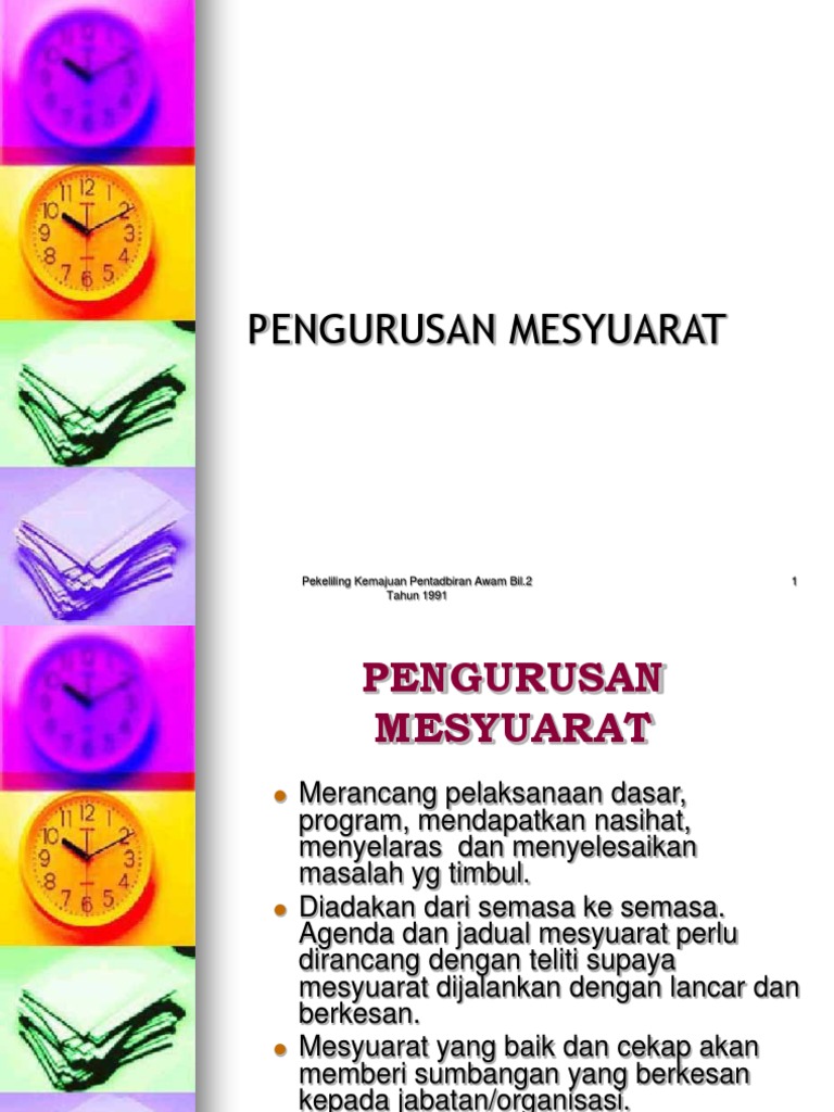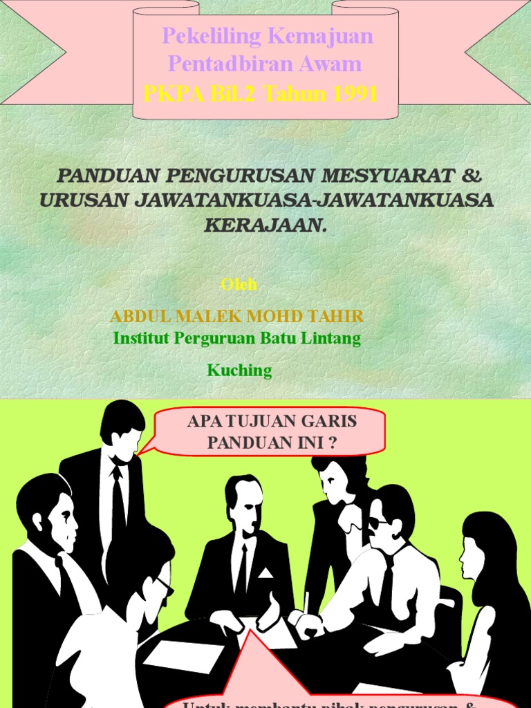 Panduan mengenai manual prosedur kerja dan fail meja yang dikeluarkan pada 1 julai 1991 serta pkpa bil. 3 tahun 1993 panduan mengenai piagam pelanggan. Memastikan persediaan kemudahan bilik mesyuarat bilik bersih dan kemas tempat duduk mencukupi kelengkapan peralatan seperti alat tulis, ohp dan pembesar suara 6. 8 tahun 1991 panduan mengenai manual prosedur kerja dan fail meja telah dikaji dan ditambah baik. Pekeliling ini menggantikan pkpa bil.