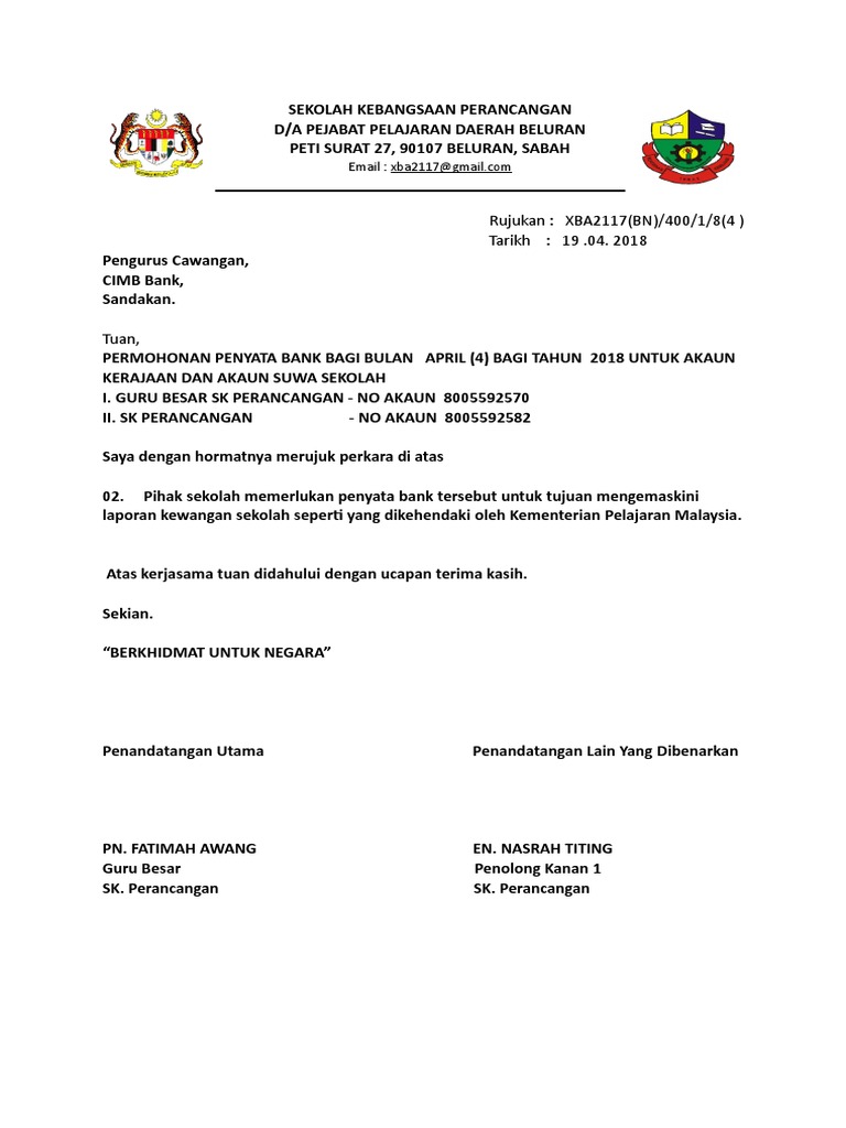 For more information and source, see on this link : Contoh surat rasmi permohonan buka akaun bank persatuan cute766. 2018 pengurus cawangan, cimb bank, sandakan. Format surat rasmi dalam english; Contoh surat rasmi permohonan penyata bank cimb surat rasmi z. Contoh cv lamaran kerja inggris Surat iringan ambil penyata bank atm 216. Surat iringan ambil penyata bank atm 216. For more information and source, see on this link : Tuan, permohonan penyata bank bagi bulan april (4) bagi tahun 2018 untuk akaun kerajaan dan akaun suwa sekolah i. Surat tidak rasmi kepada perdana menteri; Cara mendapatkan statement atau penyata kewangan maybank secara online. For more information and source, see on this link :