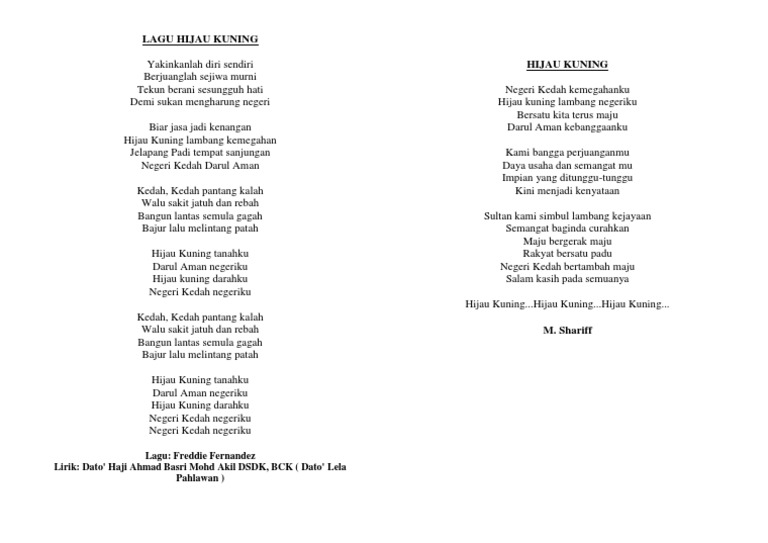 Yakinkanlah diri sendiri berjuanglah sejiwa murni tekun berani sesungguh hati demi sukan mengharung negeri. Terimakasih telah berkunjung di blog kami mohon memberikan komentar yang membangun untuk blog kami ini terimakasih. Allah selamat sultan mahkota, lagu negeri kedah darul aman. Padamu negeri kami berjanji padamu negeri kami berbakti padamu negeri kami mengabdi bagimu negeri jiwa raga kami. Lagu negeri, negeri sembilan mp3 duration 1:03 size 2.40 mb / pak moes 10. Biar saja ku tak sehebat matahari tapi s'lalu ku coba tuk menghangatkanmu biar saja ku tak setegar batu karang tapi s'lalu ku coba tuk melindungimu. Hijau kuning tanahku darul aman negeriku hijau kuning darahku negeri kedah negeriku. Chordify is your #1 platform for chords. Provided to azclip by one stop music kedah serata rata · projek hk kedah serata rata ℗ 2016 musicscape asia plt. Asalnya, lagu ini ciptaan j. Berikut kutipan lirik lagunya wis kebacut ambyar remuk sing ning ati opo ngene iki sing jenenge korban janji wis ambyar aku kudu kepiye metu ngendi. Dato' haji ahmad basri mohd akil dsdk, bck ( dato' lela. Hijau, kuning tanahku darul aman negeriku hijau, kuning darahku negeri kedah negeriku.